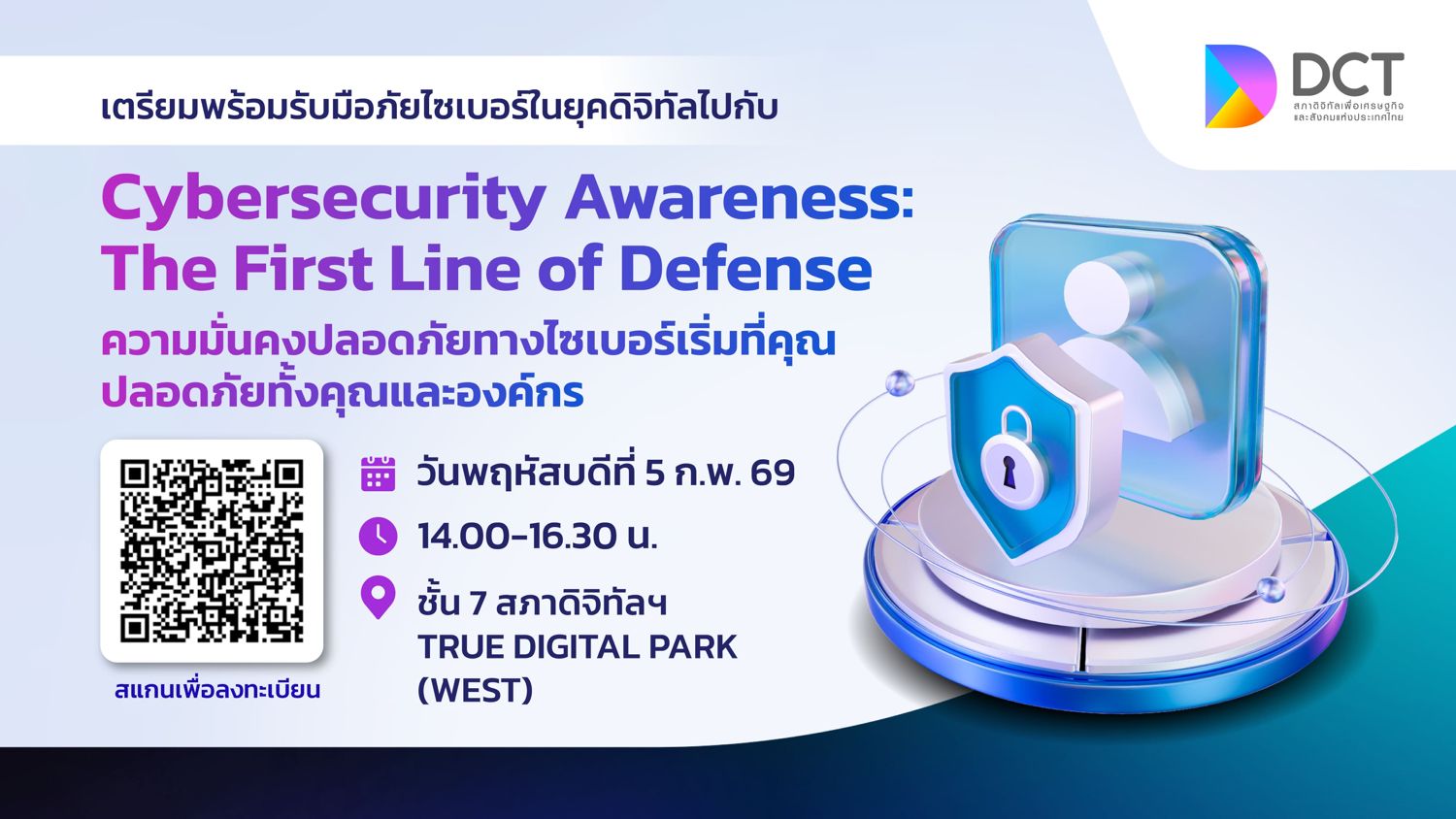 ในยุคดิจิทัล "ความปลอดภัย" คือหัวใจสำคัญ สภาดิจิทัลฯ (DCT) ขอเชิญร่วมเวิร์กชอปเจาะลึก Cybersecurity Awareness: The First Line of Defense เพื่อเตรียมพร้อมรับมือภัยคุกคามรูปแบบใหม่ที่ใกล้ตัวกว่าที่คิด