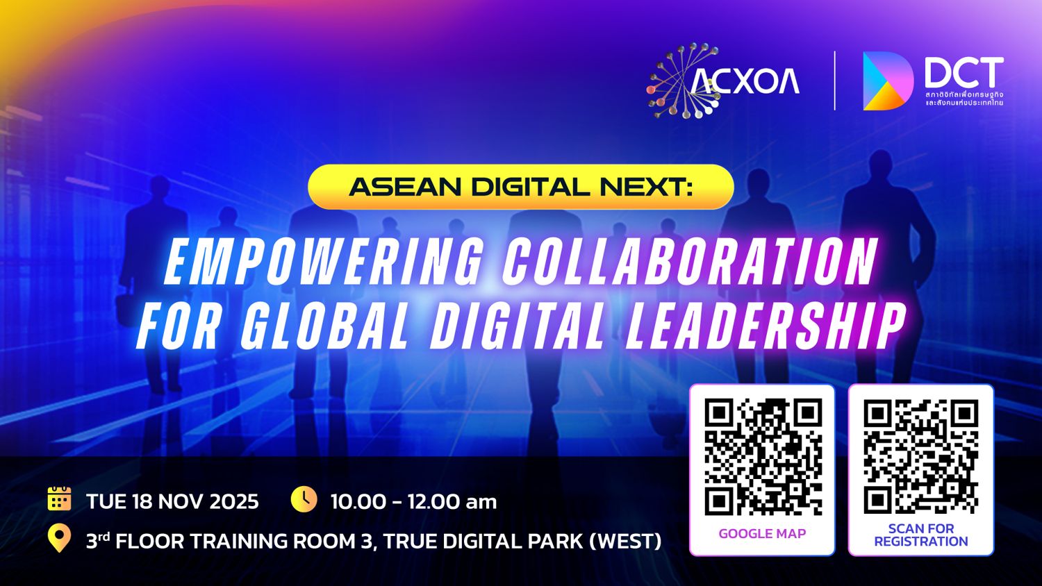 สภาดิจิทัลเพื่อเศรษฐกิจและสังคมแห่งประเทศไทย (DCT) มีความยินดีเป็นอย่างยิ่งที่จะเรียนเชิญท่านเข้าร่วมงานลงนามบันทึกข้อตกลงความเข้าใจ (MOU) ครั้งสำคัญ ระหว่าง DCT และ ASEAN CXO Association (ACXOA) เพื่อประกาศความร่วมมือภายใต้งาน ASEAN Digital Next: Empowering Collaboration for Global Digital Leadership