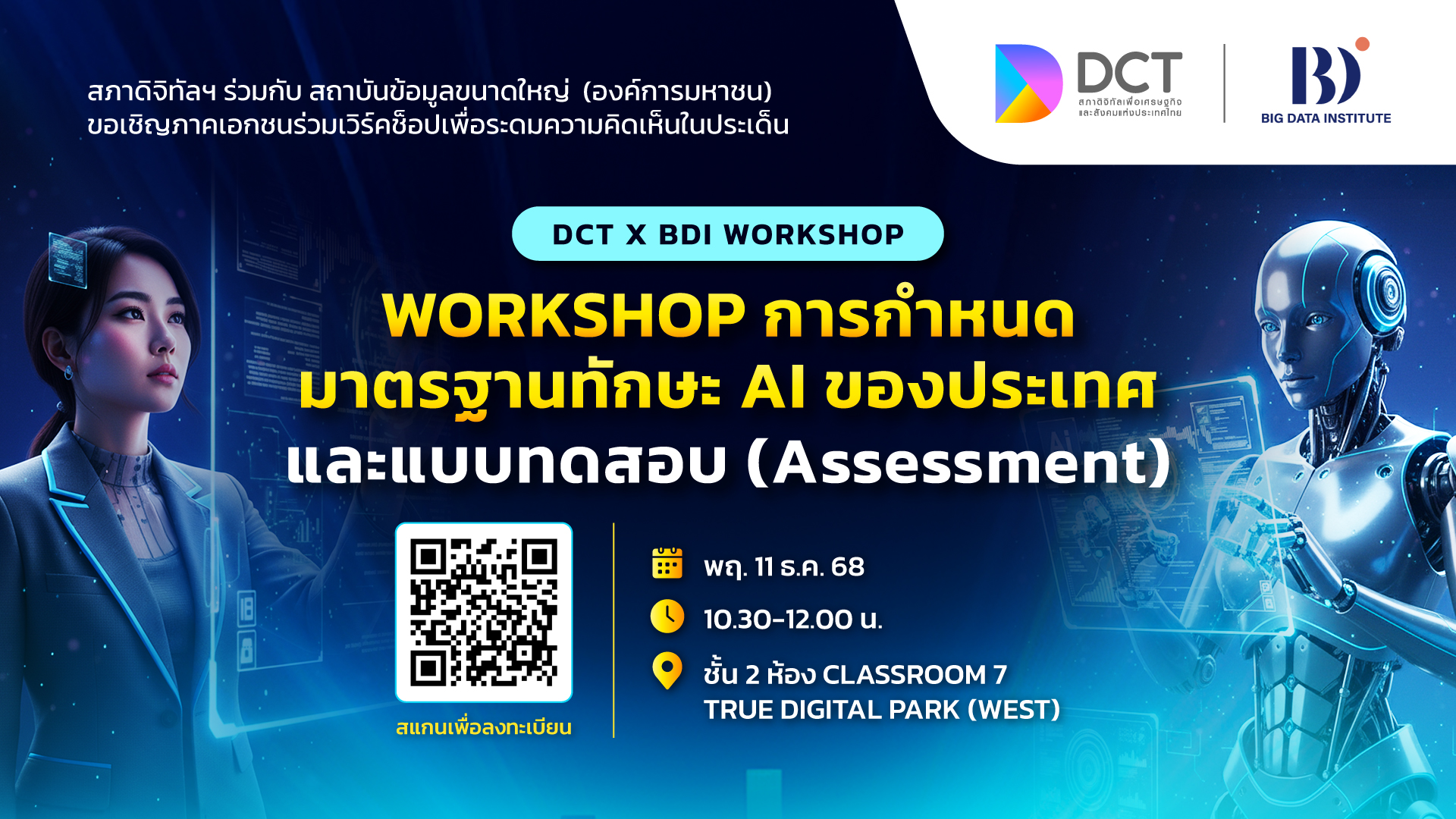 สภาดิจิทัลฯ (DCT) ร่วมกับ สถาบันข้อมูลขนาดใหญ่ (BDI) ขอเชิญผู้ที่สนใจร่วม Workshop ในหัวข้อ "การกำหนดมาตรฐานทักษะ AI ของประเทศ และแบบทดสอบ (Assessment)"