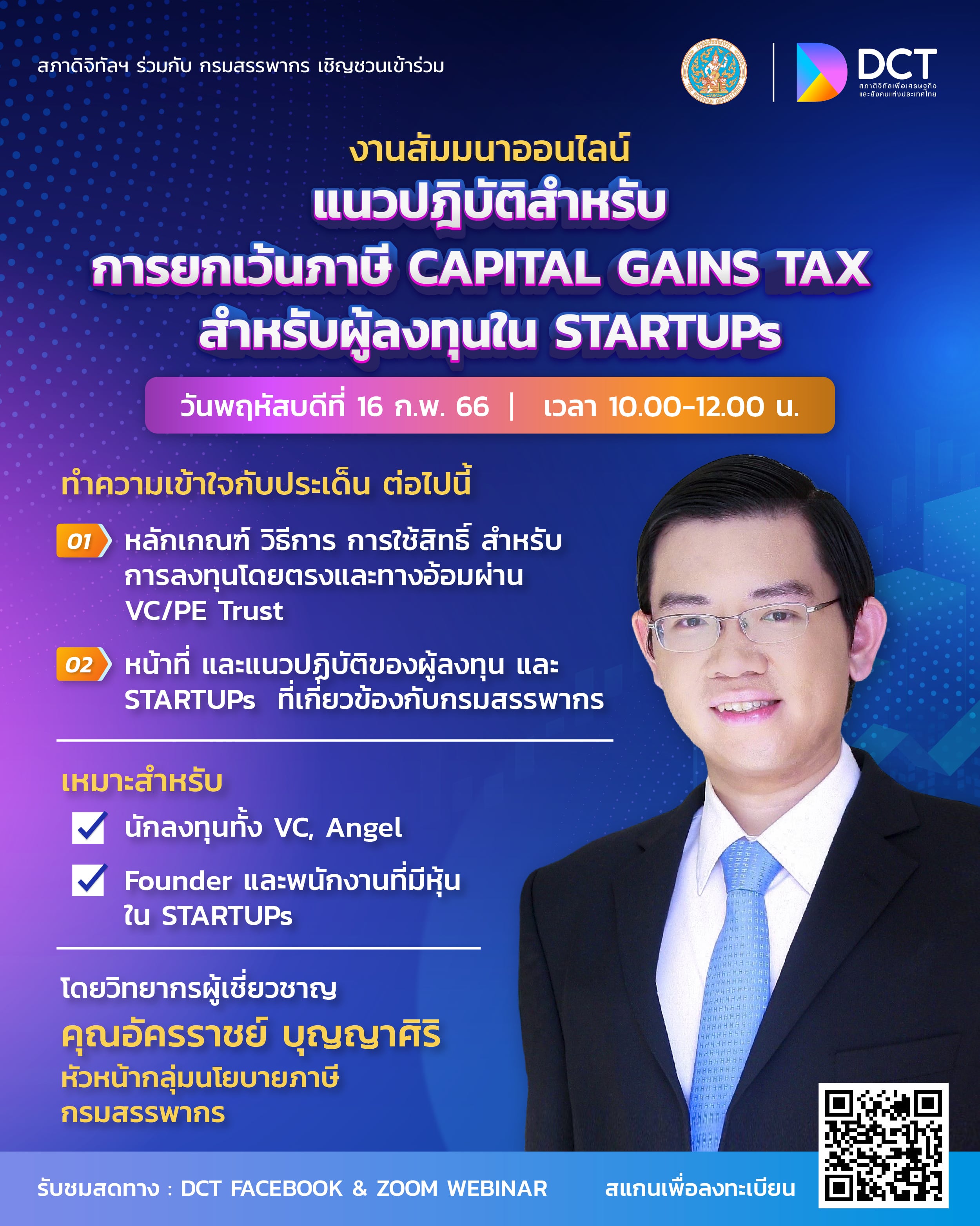 ขอเชิญชวนผู้ที่สนใจเข้าร่วมงานสัมมนาออนไลน์ หัวข้อ “แนวปฏิบัติสำหรับการยกเว้นภาษี Capital Gains Tax สำหรับผู้ลงทุนใน Startups”