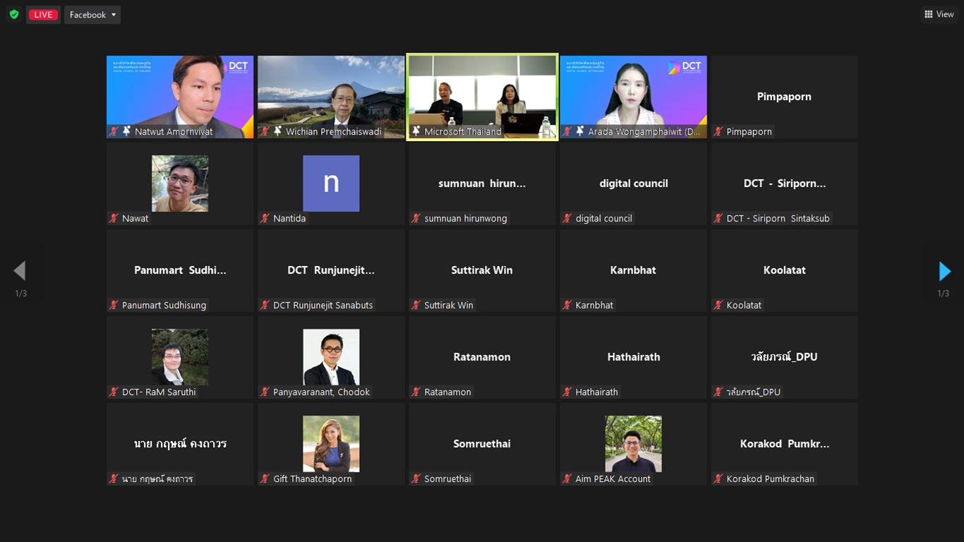 วันพุธที่ 22 มีนาคม 2566 - “สภาดิจิทัลเพื่อเศรษฐกิจและสังคมแห่งประเทศไทย” โดย “ศ.ดร.วิเชียร เปรมชัยสวัสดิ์” รองประธานสภาดิจิทัลเพื่อเศรษฐกิจและสังคมแห่งประเทศไทยและประธานคณะกรรมการพันธกิจด้านพัฒนาเศรษฐกิจดิจิทัล (ระหว่างประเทศ) และ “นายณัฐวุฒิ อมรวิวัฒน์” รองประธานสภาดิจิทัลเพื่อเศรษฐกิจและสังคมแห่งประเทศไทยและประธานคณะกรรมการพันธกิจด้าน Startups ร่วมกับ “บริษัท ไมโครซอฟท์ (ประเทศไทย) จำกัด” โดย “นางอาภาพร สกุลกิตติยุต” Lead Data Scientist บริษัท ไมโครซอฟท์ (ประเทศไทย) จำกัด และ “นายโอม ศิวะดิตถ์” National Technology Officer บริษัท ไมโครซอฟท์ (ประเทศไทย) จำกัด จัดงานเสวนาออนไลน์ หัวข้อ “โอกาสทางธุรกิจและการทำงานด้วยศักยภาพ ChatGPT” เพื่อแลกเปลี่ยนความรู้ในประเด็นโอกาสของธุรกิจกับประโยชน์ที่ได้จาก ChatGPT การปรับตัวของภาคการศึกษาและภาคธุรกิจให้สอดรับกับการเปลี่ยนแปลงอย่างก้าวกระโดดของเทคโนโลยีดิจิทัล รวมถึง ChatGPT ตลอดจนการแชร์ ChatGPT Case Study เป็นต้น
