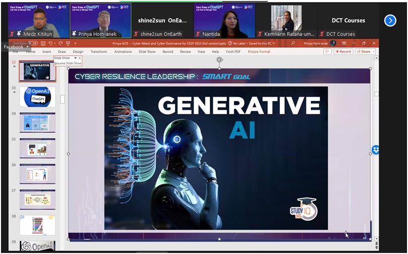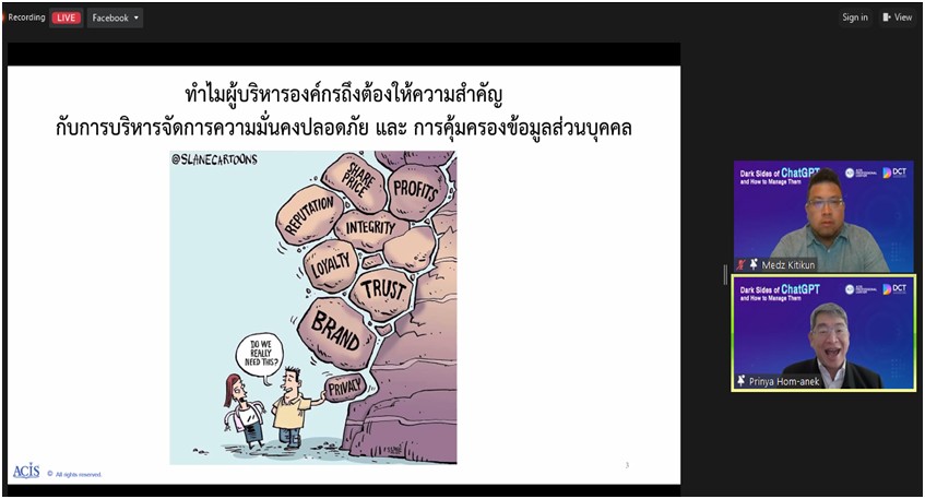 วันพฤหัสบดีที่ 17 สิงหาคม 2566 สภาดิจิทัลเพื่อเศรษฐกิจและสังคมแห่งประเทศไทย (DCT) โดย “นางเขมนรินทร์ รัตนาอัมพวัลย์” รองประธานสภาดิจิทัลเพื่อเศรษฐกิจและสังคมแห่งประเทศไทย และประธานพันธกิจด้านการพัฒนาศักยภาพทรัพยากรมนุษย์ด้านดิจิทัล และ “ดร.เมธวิน กิติคุณ” กรรมการสภาดิจิทัลเพื่อเศรษฐกิจและสังคมแห่งประเทศไทย ร่วมกับ บริษัท เอซิส โปรเฟสชั่นนัล เซ็นเตอร์ จำกัด (ACIS) โดย “อาจารย์ ปริญญา หอมอเนก” Chairman of the executive committee ร่วมกันเสวนาออนไลน์ Online talk with Specialist ในหัวข้อ “Dark Sides of ChatGPT and How to Manage Them" โดยการเสวนาในครั้งนี้มีวัตถุประสงค์เพื่อให้เกิดตระหนักในการใช้งานทั้งการทำงานในองค์กรและชีวิตประจำวัน นำไปสู่การเรียนรู้ถึงวิธีจัดการให้เกิดประโยชน์สูงสุดโดยคำนึงถึงความถูกต้องและปลอดภัย ซึ่งมีประเด็นเสวนาที่น่าสนใจ ได้แก่ ข้อมูลเกี่ยวกับ “ChatGPT“ AI อัจฉริยะเทคโนโลยีใหม่แห่งยุค, GENERATIVE AI และ CHATGPT คืออะไร, ภัยคุกคามที่เกี่ยวข้องทั้งด้าน security และ privacy, ผลกระทบที่เกี่ยวข้องกับองค์กรและส่วนบุคคล และประเด็นที่เราต้องเตรียมตัวเพื่อรับมือกับ ChatGPT