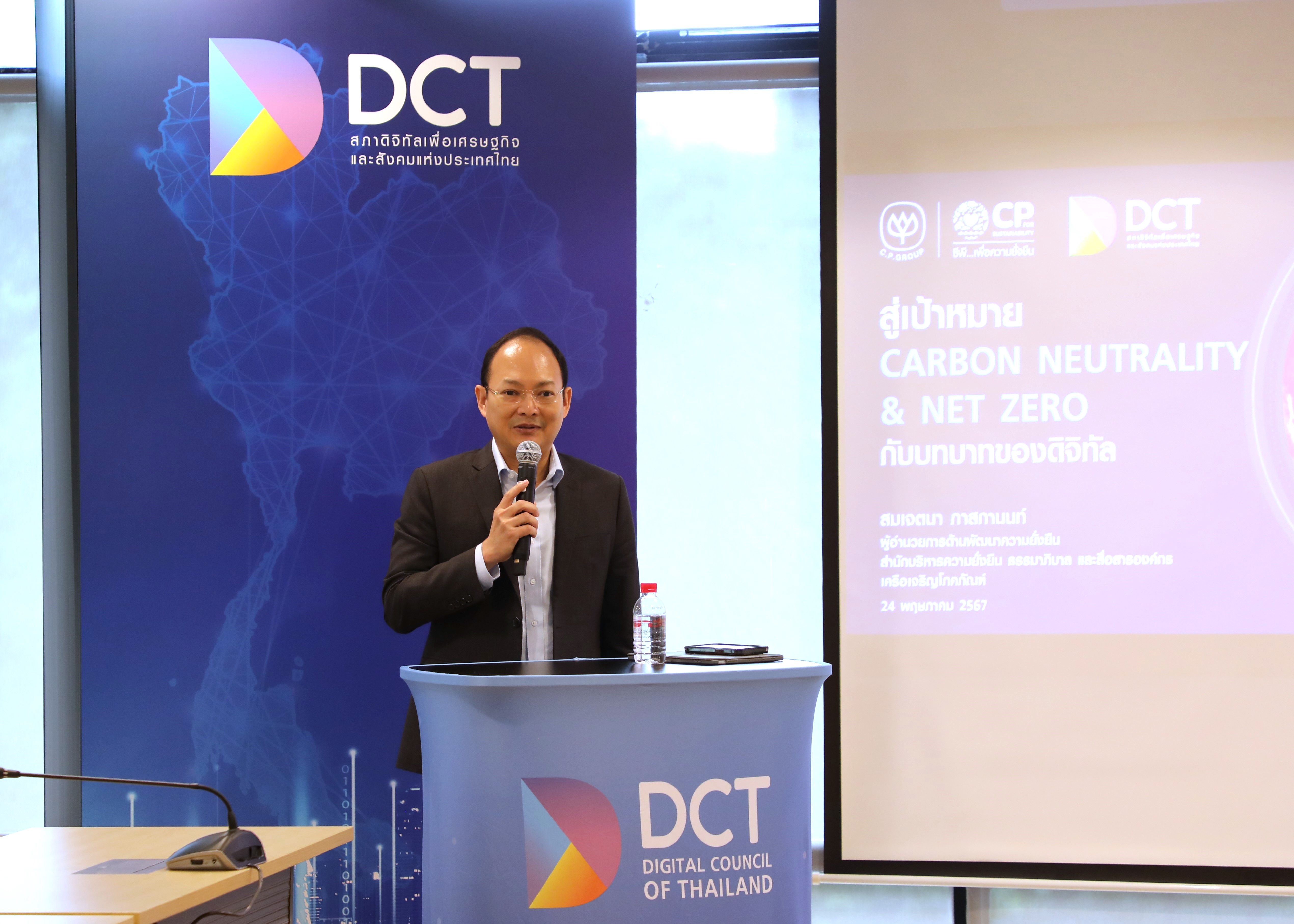วันศุกร์ที่ 24 พฤษภาคม 2567, อาคารสุทธิ ชั้น 4 ถนนเพชรบุรีตัดใหม่ กรุงเทพฯ - “สภาดิจิทัลเพื่อเศรษฐกิจและสังคมแห่งประเทศไทย (DCT)” โดย “นายลักษมณ์ เตชะวันชัย” รองประธานสภาดิจิทัลเพื่อเศรษฐกิจและสังคมแห่งประเทศไทย และประธานพันธกิจด้านดิจิทัลเพื่อความยั่งยืน จัดงานเวิร์กช๊อปหัวข้อ "สู่เป้าหมาย Carbon Neutrality & Net Zero กับบทบาทของดิจิทัล" โดยได้รับเกียรติจากผู้ทรงคุณวุฒิจากหลากหลายภาคส่วนร่วมเป็นวิทยากร “นายพิทักษ์ สุภนันทการ” ผู้ทรงคุณวุฒิด้านพืช สภาเกษตรกรแห่งชาติ และ “นายสมเจตนา ภาสกานนท์” ผู้อำนวยการด้านพัฒนาความยั่งยืน สำนักบริหารความยั่งยืน ธรรมาภิบาลและสื่อสารองค์กร เครือเจริญโภคภัณฑ์ มาร่วมแลกเปลี่ยนความคิดเห็นและแนวทางในการขับเคลื่อนประเทศไทยสู่เป้าหมาย Net Zero อย่างยั่งยืน