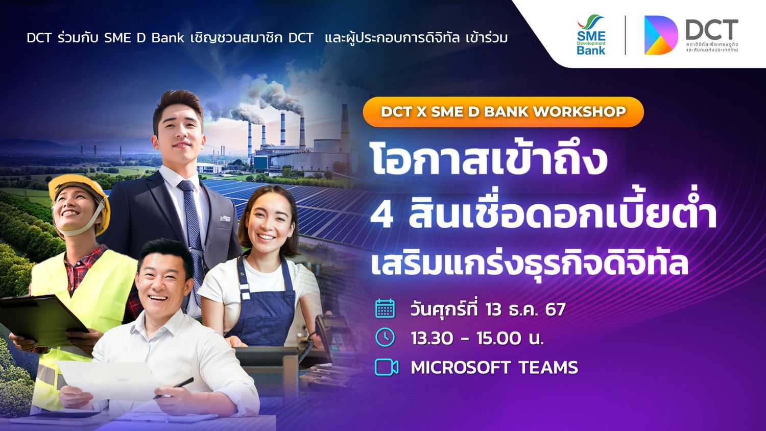 สภาดิจิทัลเพื่อเศรษฐกิจและสังคมแห่งประเทศไทย (DCT) ร่วมกับ ธนาคารพัฒนาวิสาหกิจขนาดกลางและขนาดย่อมแห่งประเทศไทย (SME D Bank) เชิญชวนสมาชิกสภาดิจิทัลฯ และ ผู้ประกอบการอุตสาหกรรมดิจิทัลเข้าร่วมงาน Online Workshop หัวข้อ "โอกาสเข้าถึง 4 สินเชื่อดอกเบี้ยต่ำ เสริมแกร่งธุรกิจดิจิทัล"