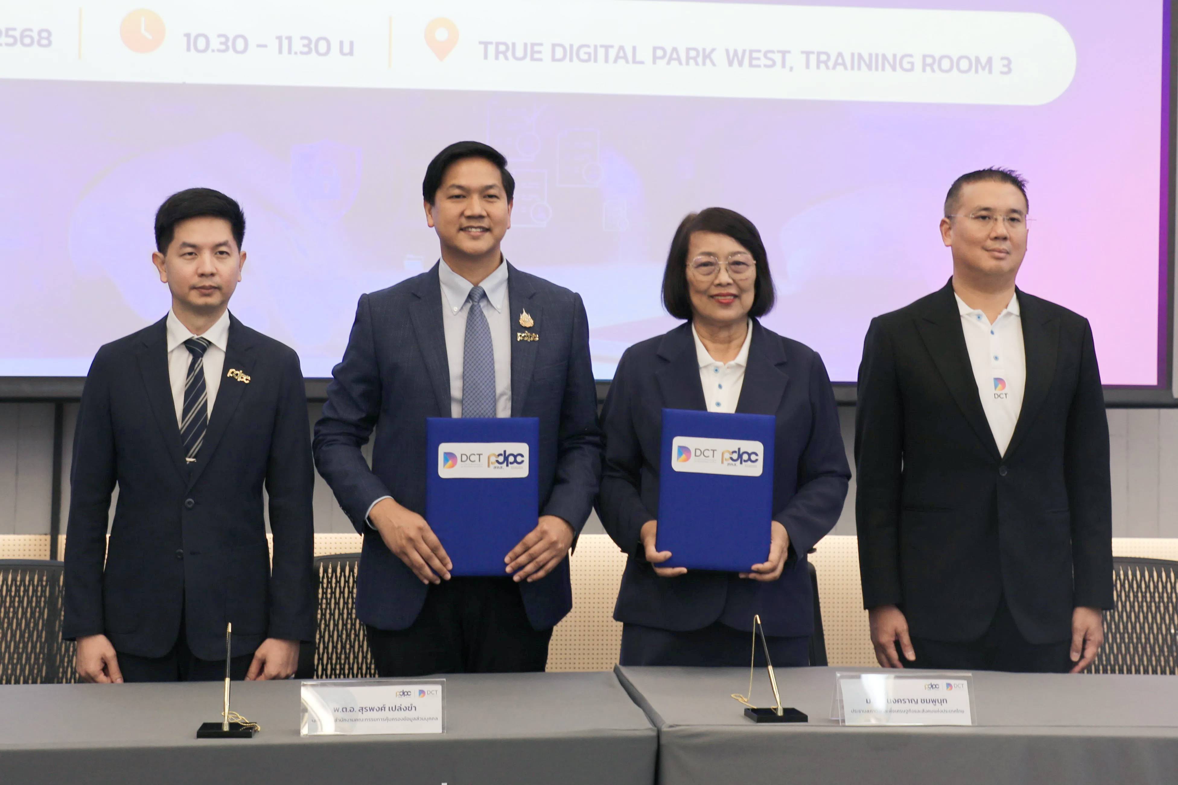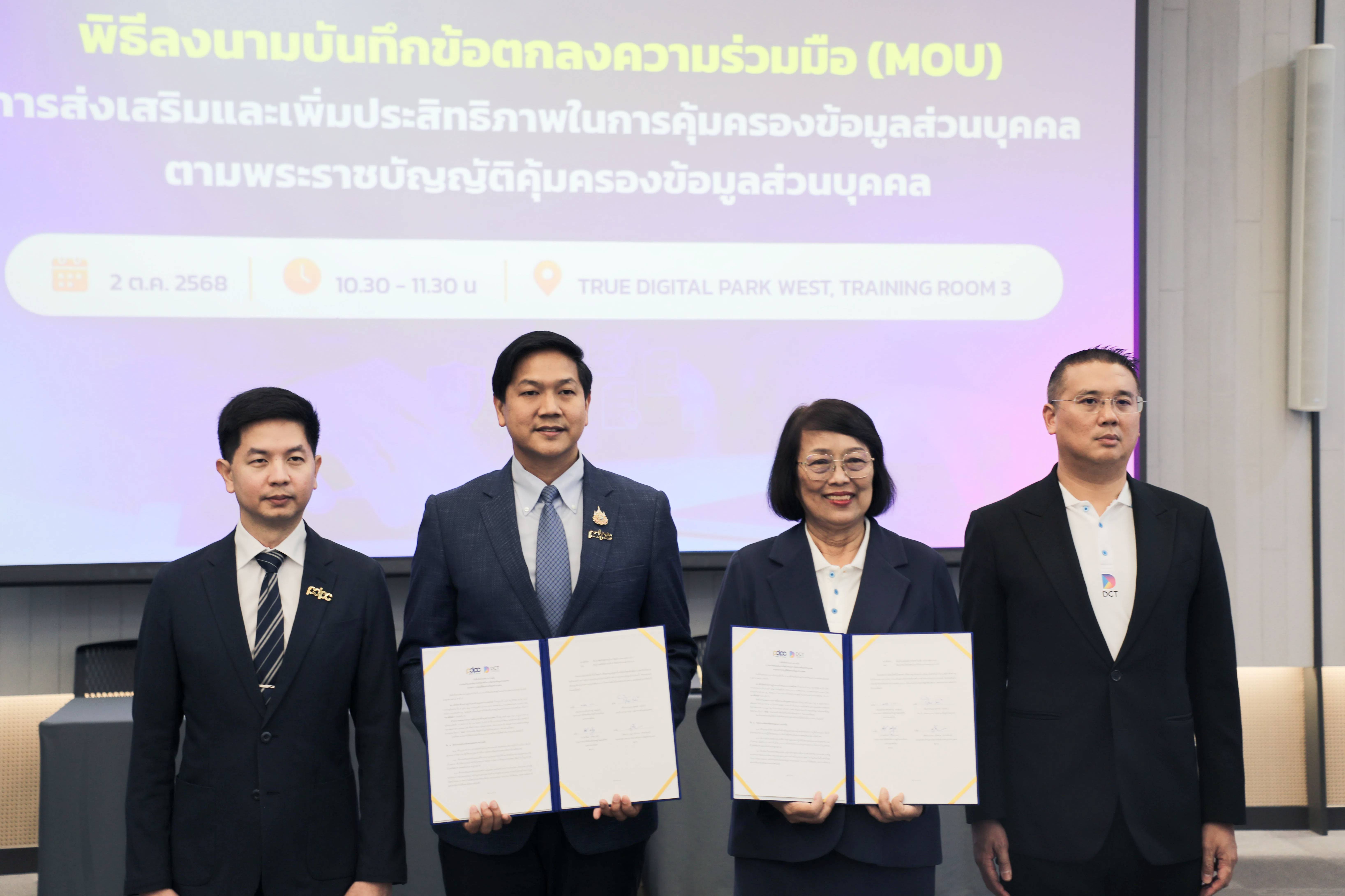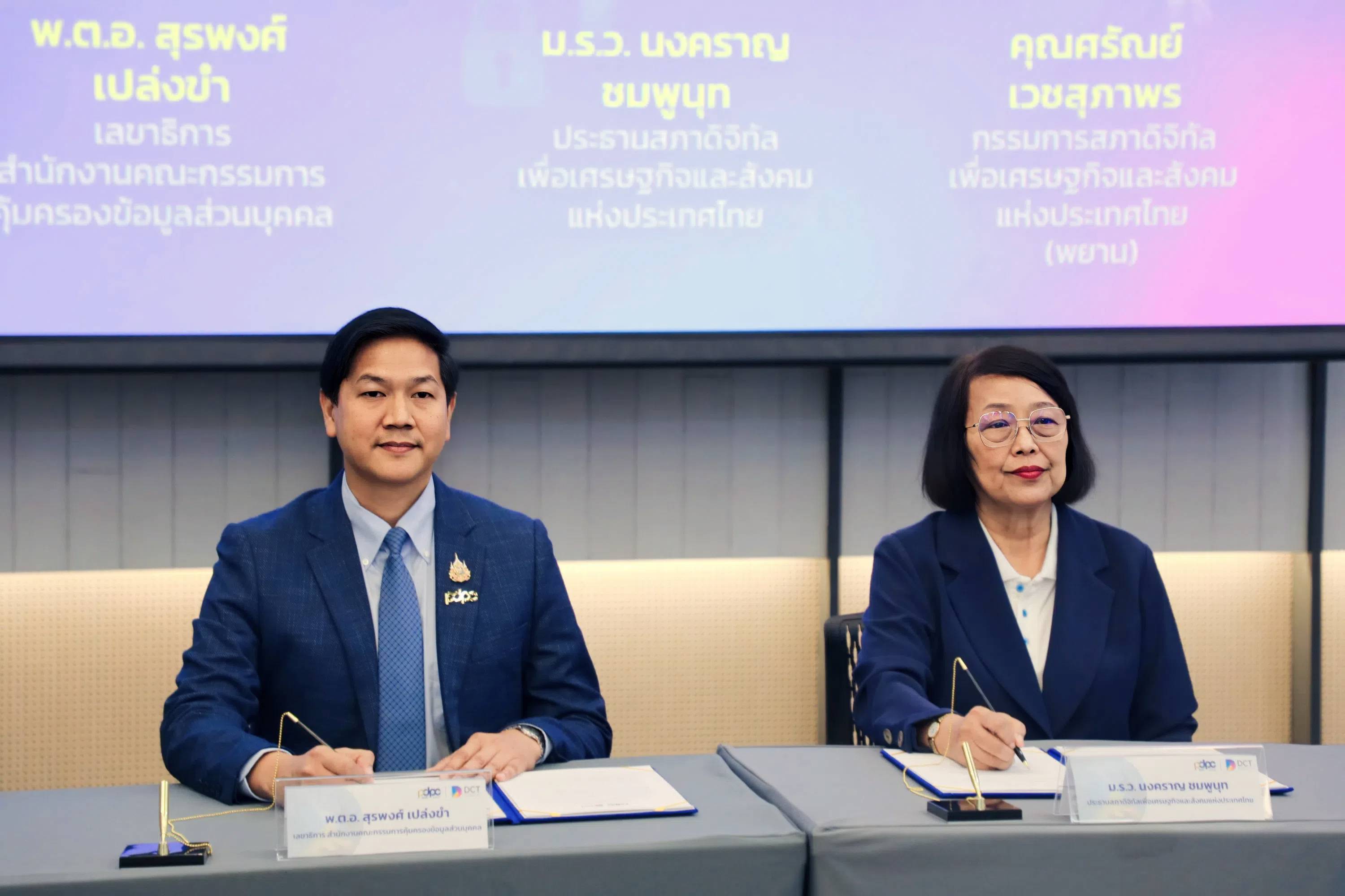 วันพฤหัสบดีที่ 2 ตุลาคม 2568 - สภาดิจิทัลเพื่อเศรษฐกิจและสังคมแห่งประเทศไทย (สภาดิจิทัลฯ) โดย ม.ร.ว. นงคราญ ชมพูนุท ประธานสภาดิจิทัลฯ และ สำนักงานคณะกรรมการคุ้มครองข้อมูลส่วนบุคคล (สคส.) โดย พ.ต.อ. สุรพงศ์ เปล่งขำ เลขาธิการ สคส. จัดพิธีลงนามบันทึกข้อตกลงความร่วมมือ (MOU) เรื่อง “การส่งเสริมและเพิ่มประสิทธิภาพในการคุ้มครองข้อมูลส่วนบุคคลตามพระราชบัญญัติคุ้มครองข้อมูลส่วนบุคคล” โดยมี พ.ต.อ. ณัทกฤช พรหมจันทร์ รองเลขาธิการ สคส. และ นายศรัณย์ เวชสุภาพร กรรมการสภาดิจิทัลฯ และประธานคณะทำงานด้าน PDPA เป็นพยาน ณ Training Room 3 ชั้น 3 True Digital Park (West) กรุงเทพฯ