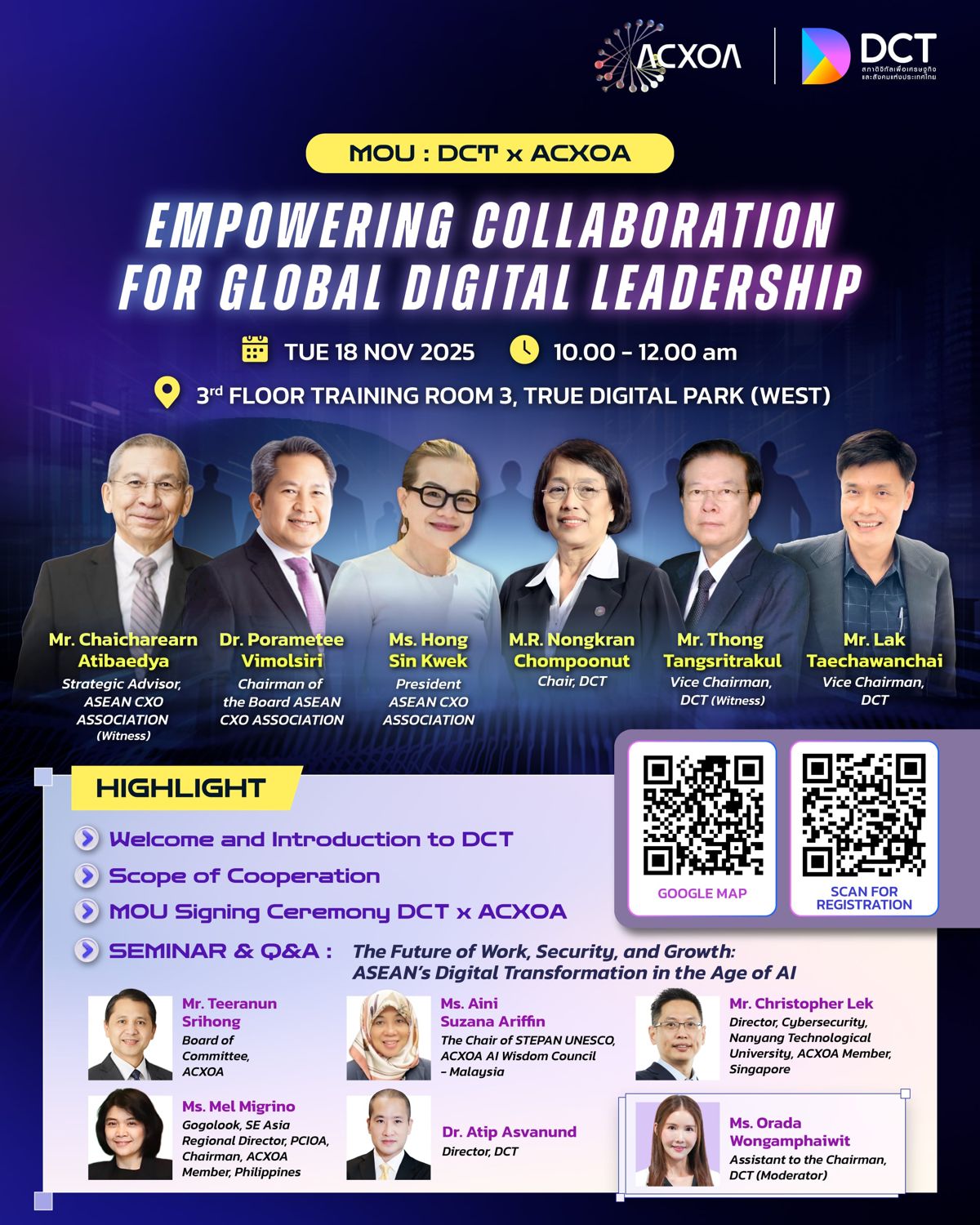 สภาดิจิทัลเพื่อเศรษฐกิจและสังคมแห่งประเทศไทย (DCT) มีความยินดีเป็นอย่างยิ่งที่จะเรียนเชิญท่านเข้าร่วมงานลงนามบันทึกข้อตกลงความเข้าใจ (MOU) ครั้งสำคัญ ระหว่าง DCT และ ASEAN CXO Association (ACXOA) เพื่อประกาศความร่วมมือภายใต้งาน ASEAN Digital Next: Empowering Collaboration for Global Digital Leadership