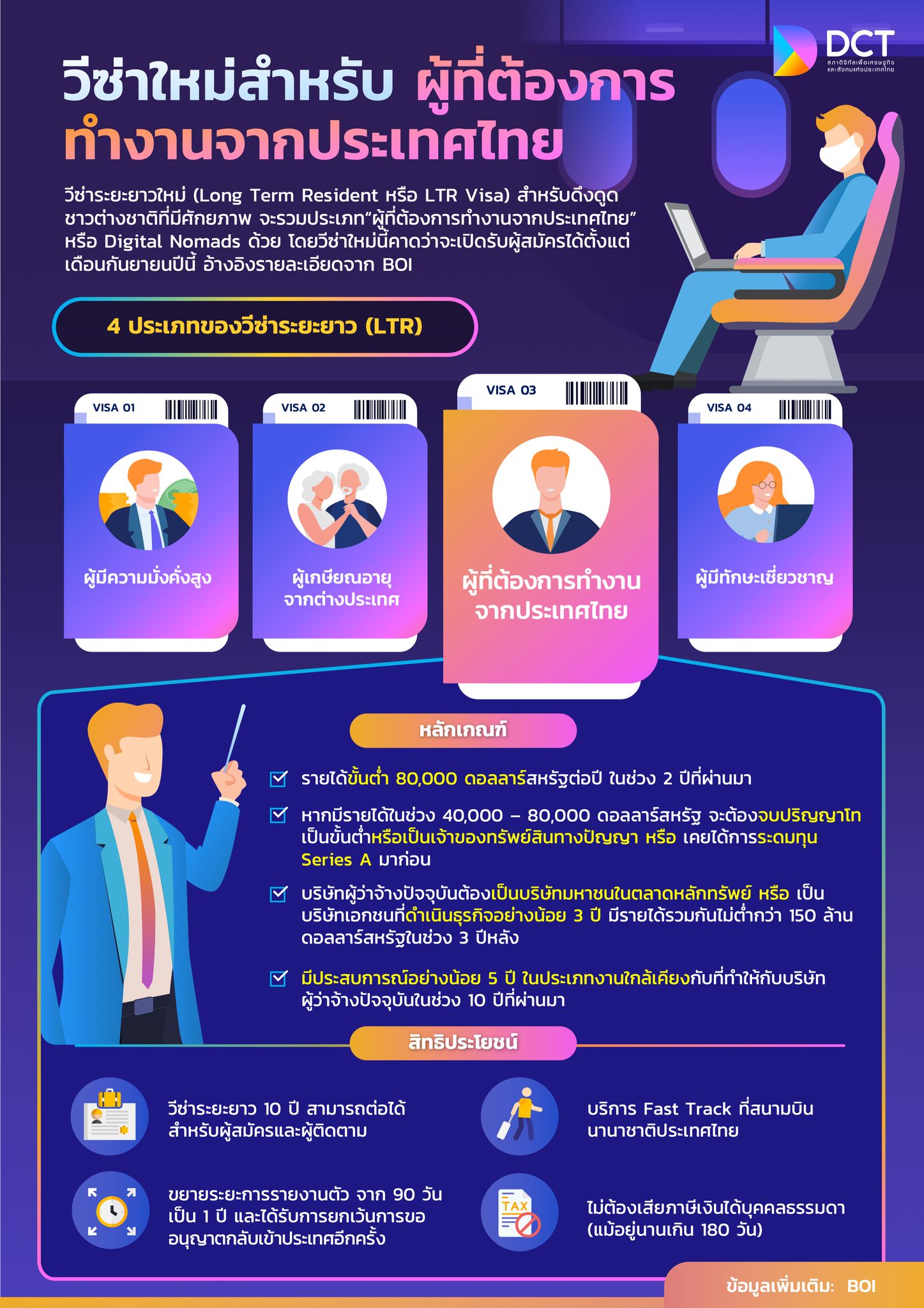 วีซ่าระยะยาวใหม่ (Long Term Resident หรือ LTR Visa) ให้มีความครอบคลุมและยืดหยุ่นมากยิ่งขึ้น ตามที่สำนักงานคณะกรรมการส่งเสริมการลงทุน (สกท) เสนอ ที่มุ่งเน้นการดึงดูดชาวต่างชาติที่มีศักยภาพนั้นมาพร้อมสิทธิประโยชน์ทางภาษีสำหรับผู้ที่มีทักษะเชี่ยวชาญต่างชาติด้วย โดยวีซ่าใหม่นี้คาดว่าจะเปิดรับผู้สมัครได้ตั้งแต่เดือนกันยายนปีนี้ อ้างอิงรายละเอียดจาก BOI เข้ามาพำนักหรือทำงานในไทยระยะยาว จำนวน 1 ล้านคน โดยแบ่งออกเป็น 4 กลุ่มเป้าหมาย ตามประเภทของวีซ่าระยะยาว (LTR) ได้แก่